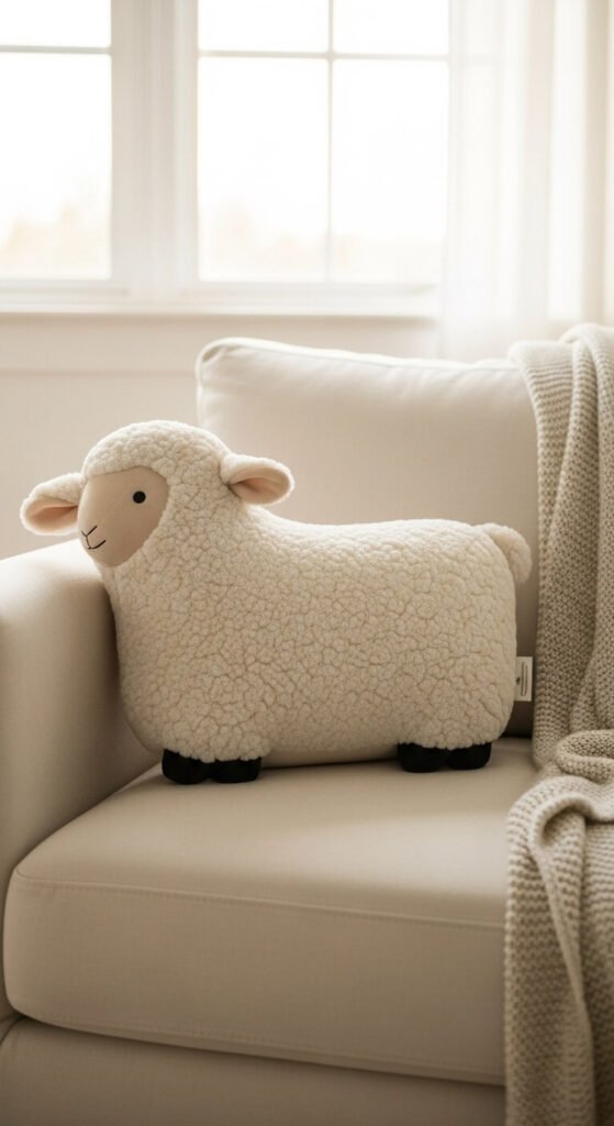 A lamb-shaped pillow adds personality without taking over a room. Look for one with a textured, fluffy surface — it reads as cozy and playful at the same time. These work great in a nursery or a reading nook. You can find them at most home decor stores for under $20. Or sew a simple cover using sherpa fabric. Stuff it with pillow fill and add felt ears. It takes about an hour and costs almost nothing.