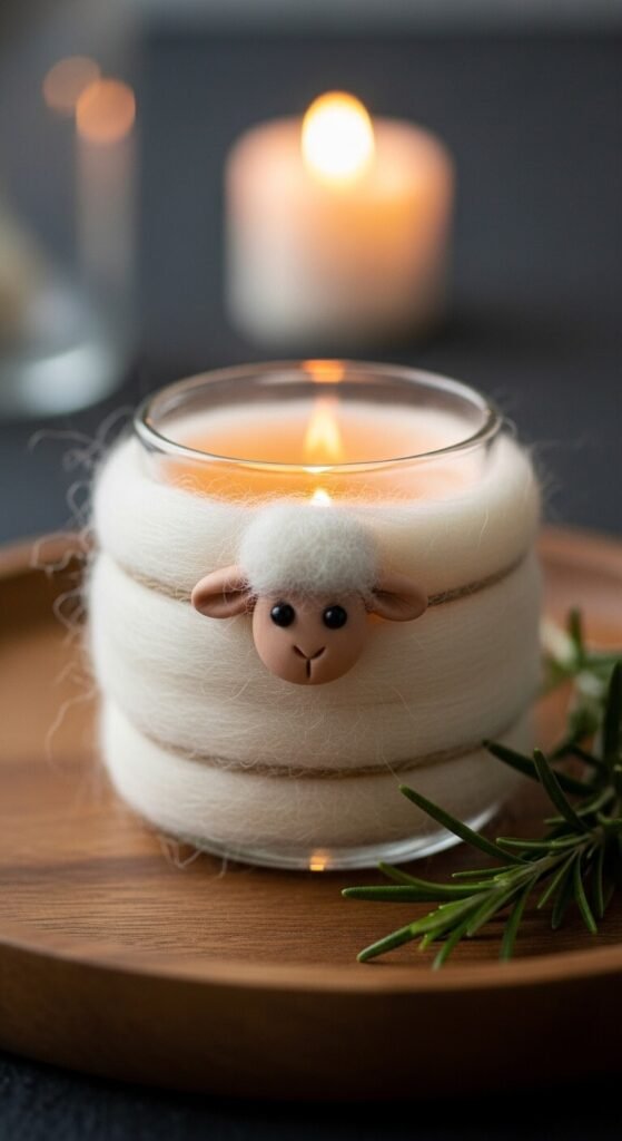 This one is a fun DIY that takes about 30 minutes. Wrap a small glass jar or votive in white wool roving or chunky yarn. Glue on a small air-dry clay head with simple features. Add tiny pipe-cleaner legs if you want a standing version. When you light the candle inside, the glow through the wool is genuinely beautiful. These make great gifts too. A bag of wool roving costs about $6 and makes several holders.