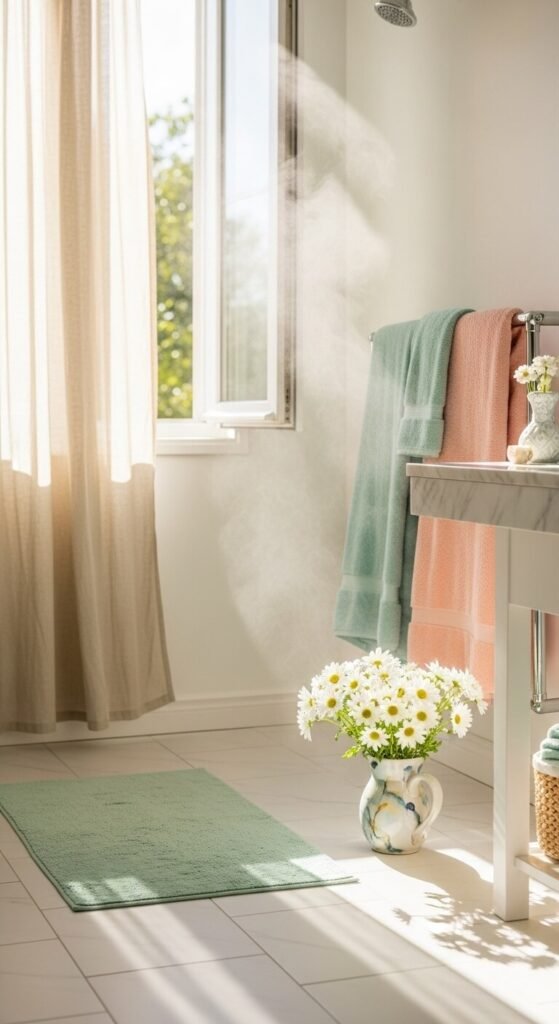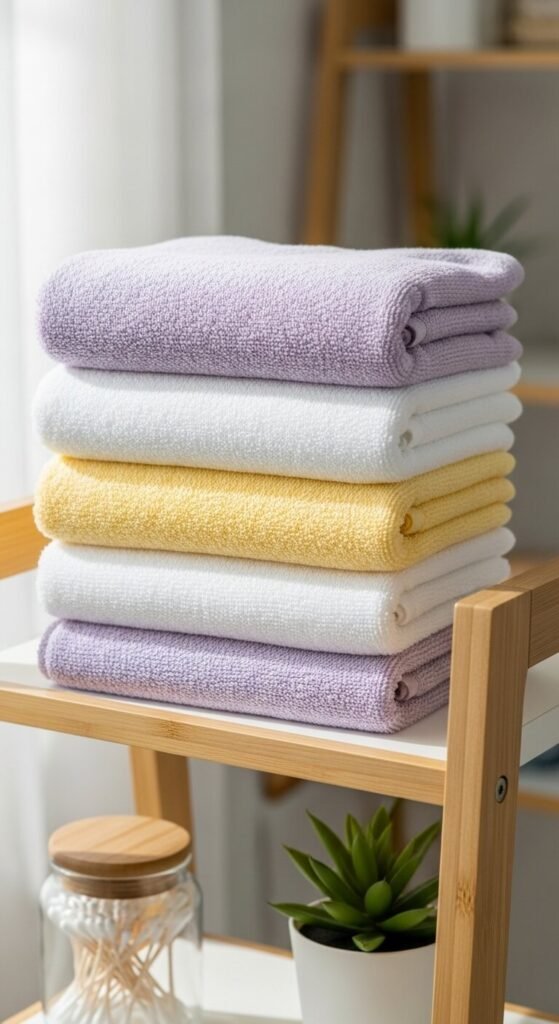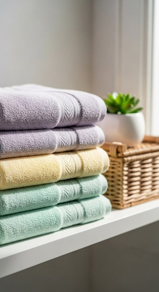Choose light cotton towels in soft pastels—think blush pink, sage green, or butter yellow. These shades catch morning light differently, making your bathroom feel larger and airier.