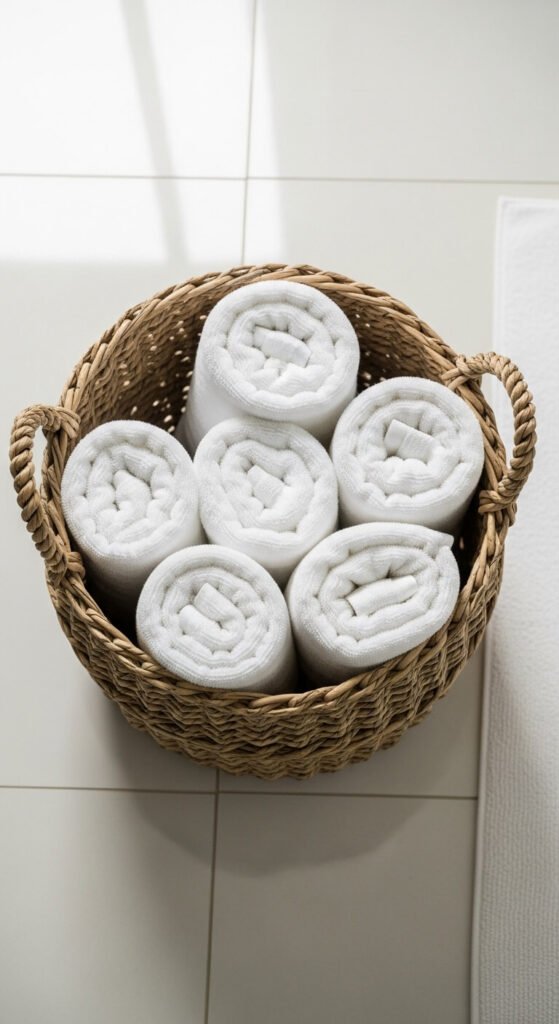 Guests can grab towels easily, and you’ll see when stock runs low. The rolled presentation takes 30 seconds per towel but elevates your whole bathroom aesthetic.