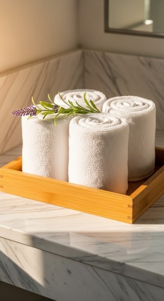 Roll hand towels tightly and stand them in a shallow tray or basket. This method saves space and looks intentional.