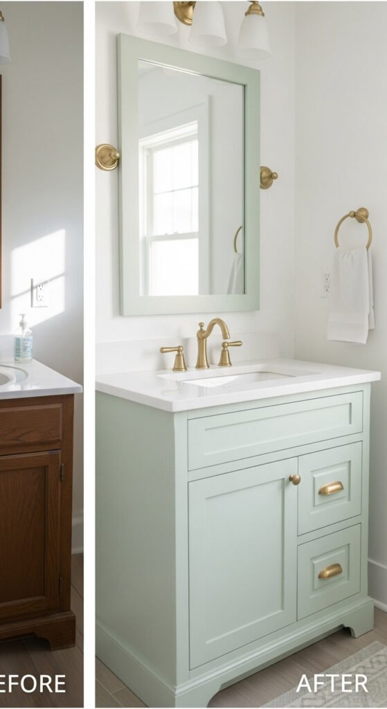Builder-grade oak vanities look dated and heavy. A fresh coat of soft-colored paint transforms them completely.