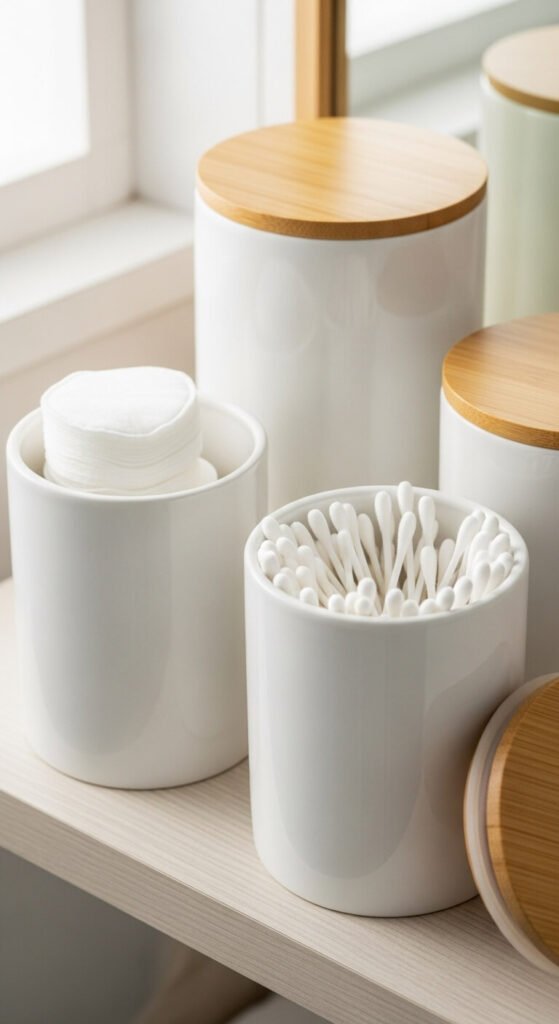 Leaving cotton products in plastic bags looks messy and unfinished. Matching ceramic jars organize while decorating.