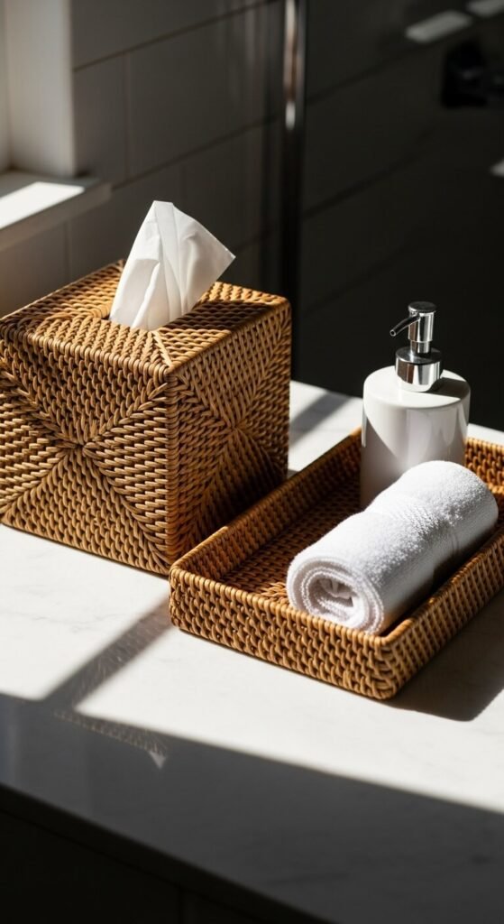 Look for rattan tissue box covers, trays, or small organizers at HomeGoods for $10-20 each. The woven texture adds dimension to flat surfaces.