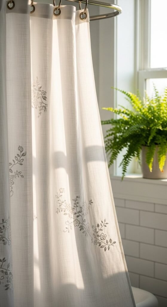 Hang it with simple metal rings for a clean look. The fabric softens the space and moves gently when you shower, creating a spa-like experience.