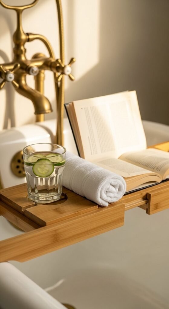 These caddies span your tub’s width, holding everything from candles to your phone safely above water. Bamboo versions resist moisture naturally and cost between $20-40.