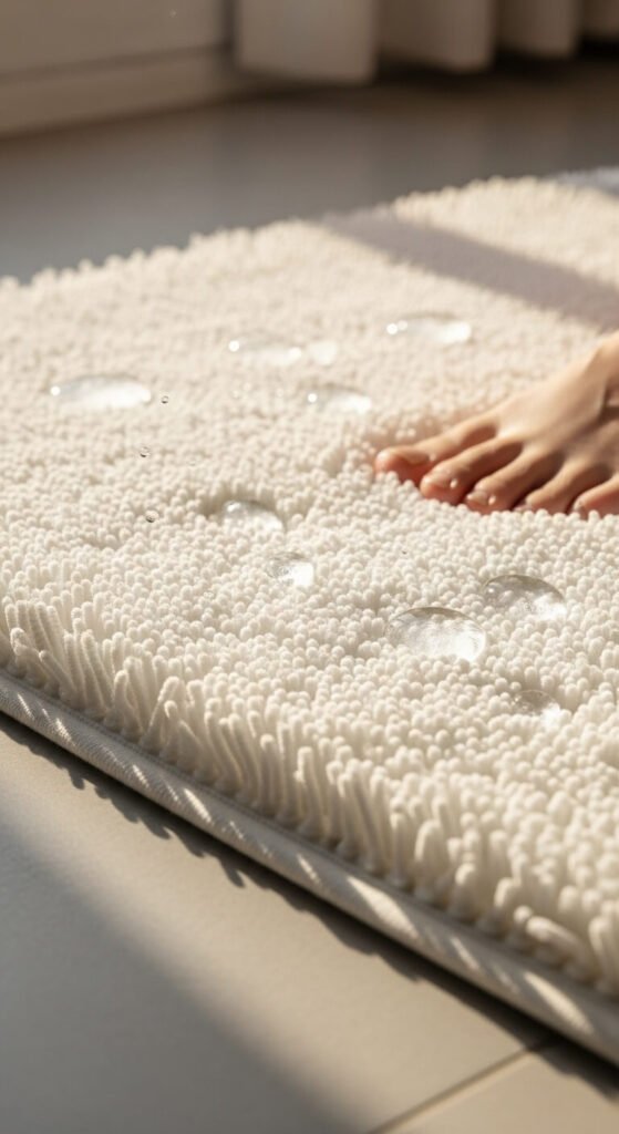 Dark mats hide dirt but make small bathrooms feel cramped. A cream or white bath mat reflects light and opens up floor space visually.