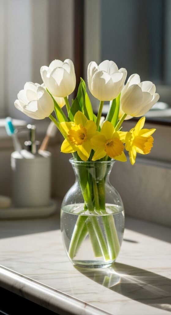 Fake flowers gather dust and look dated. Real blooms cost less than you think and transform bathroom energy instantly.