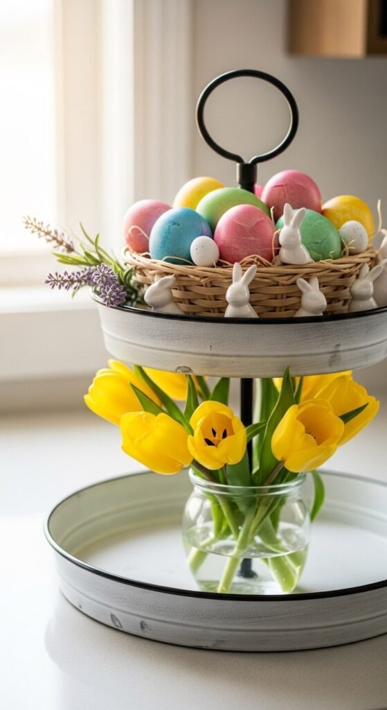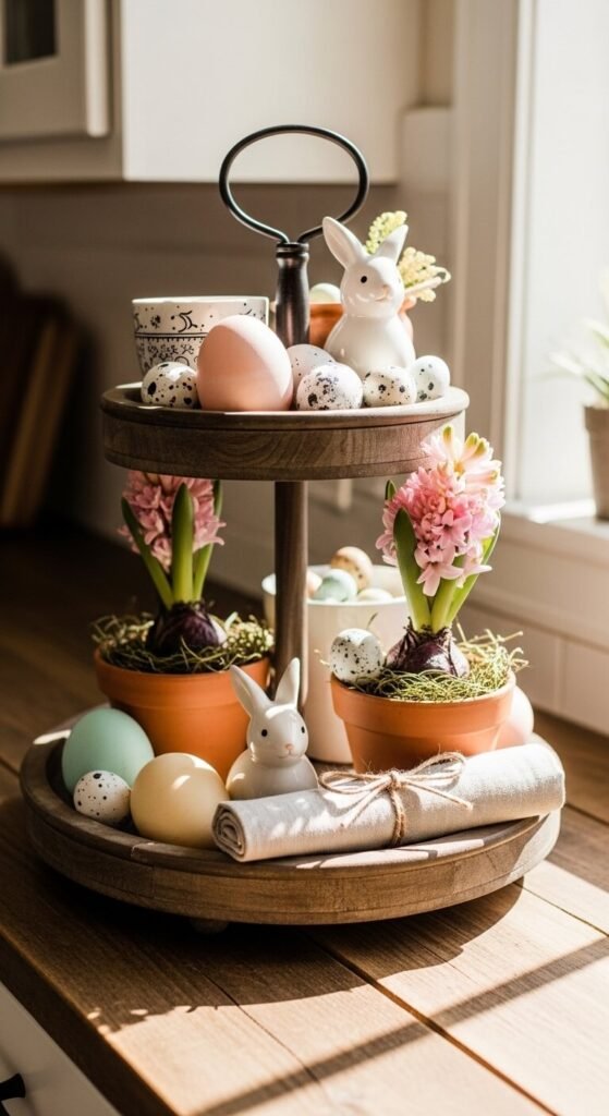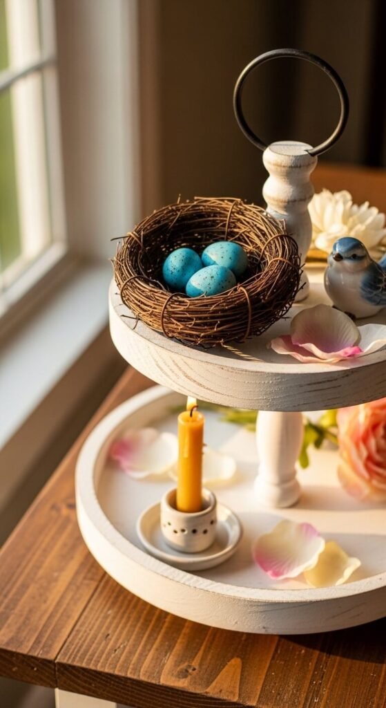 A bird’s nest with blue eggs is one of the most classic spring details. Place a small twig nest on one tier and add a ceramic or resin bluebird figurine nearby. Scatter a few faux petals around the base of the nest. A thin taper candle in a clay holder adds height. This setup has a natural, woodland feel that works in a living room, entryway, or bedroom. The nest and eggs can be found at craft stores or dollar stores for under a few dollars.