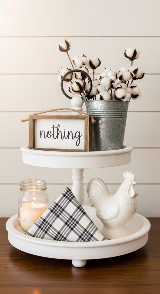 For a farmhouse-style home, lean into galvanized metal, white ceramics, and natural textures. Use a small galvanized bucket or tin as a vessel for cotton stems or dried lavender. Add a white ceramic farmhouse figurine — a rooster, a cow, or a simple house. Fold a buffalo-check or gingham napkin as a base layer on one tier. A mason jar candle ties it all together. This setup is simple, cohesive, and matches the warm, lived-in farmhouse aesthetic perfectly.