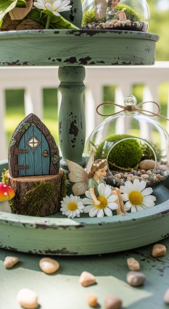 Kids and adults both love a fairy garden tray. Use a tiny fairy door, mushroom figurines, and faux moss as your base elements. Add a small glass cloche or terrarium filled with pebbles and moss. Tuck a fairy figurine into the scene. Scatter small stones or acorns around the base. This is an especially fun setup for a front porch or screened-in sunroom. Most fairy garden pieces are very affordable and easy to find. The whole setup feels like a tiny world.