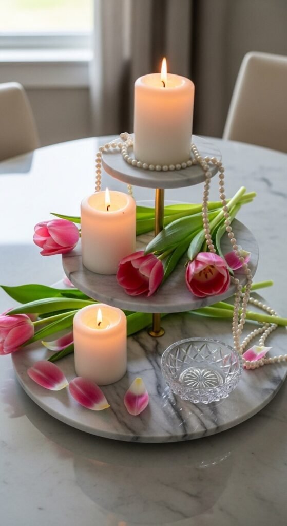 Candles and spring florals are a pairing that never fails. Use white or blush pillar candles in different heights as your focal point. Lay fresh or faux tulip stems loosely around the candles. Drape a pearl bead strand across one of the tiers for a soft, elegant detail. Add a small crystal or glass dish to catch the light. This setup is especially stunning on a dining or coffee table. Keep the flower colors soft — pale pink, white, or lavender work best.
