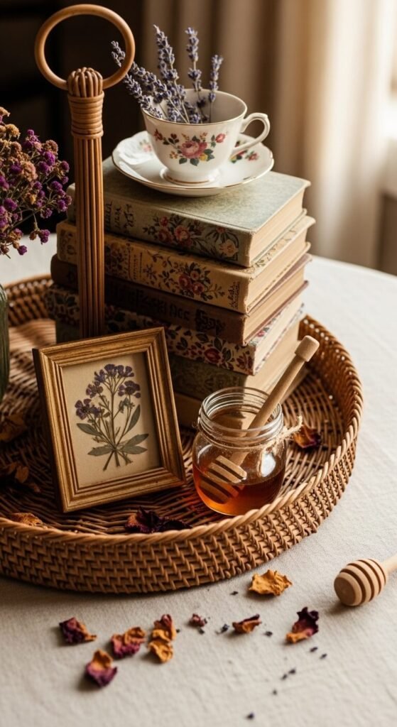 Cottagecore is all about soft, nostalgic details. Stack a few weathered or vintage-looking books on one tier. Add a teacup with dried lavender stems inside. Place a small pressed flower frame alongside a tiny jar of honey with a wooden dipper. Scatter dried petals loosely across the tray. Every element should feel like it was quietly gathered over time. Thrift stores are excellent sources for vintage teacups and small books. This setup has that slow, peaceful, countryside energy.
