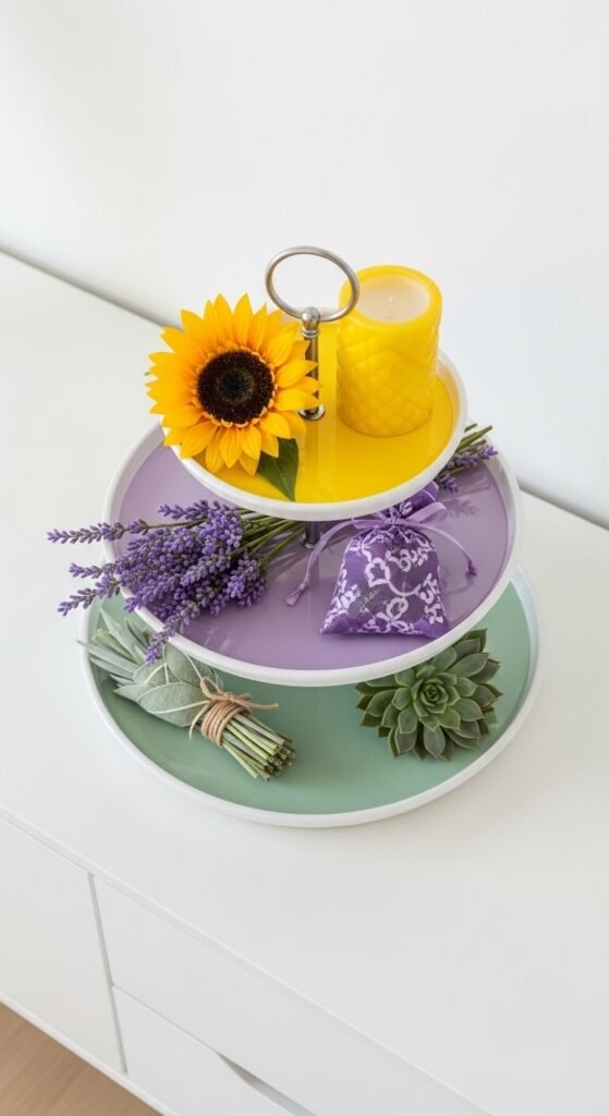 Instead of mixing colors randomly, try a color-blocked approach. Dedicate each tier to a single color family. Yellow tier: a sunflower faux stem, a yellow taper candle, and a lemon figurine. Lavender tier: purple blooms, a small lilac sachet. Green tier: a succulent, a sage bundle, and green ribbon. This makes the tray feel graphic and intentional. It is a great option if your space has a more modern or minimalist design style. No overthinking required — just pick three colors and stick to them.