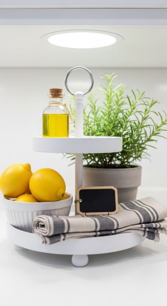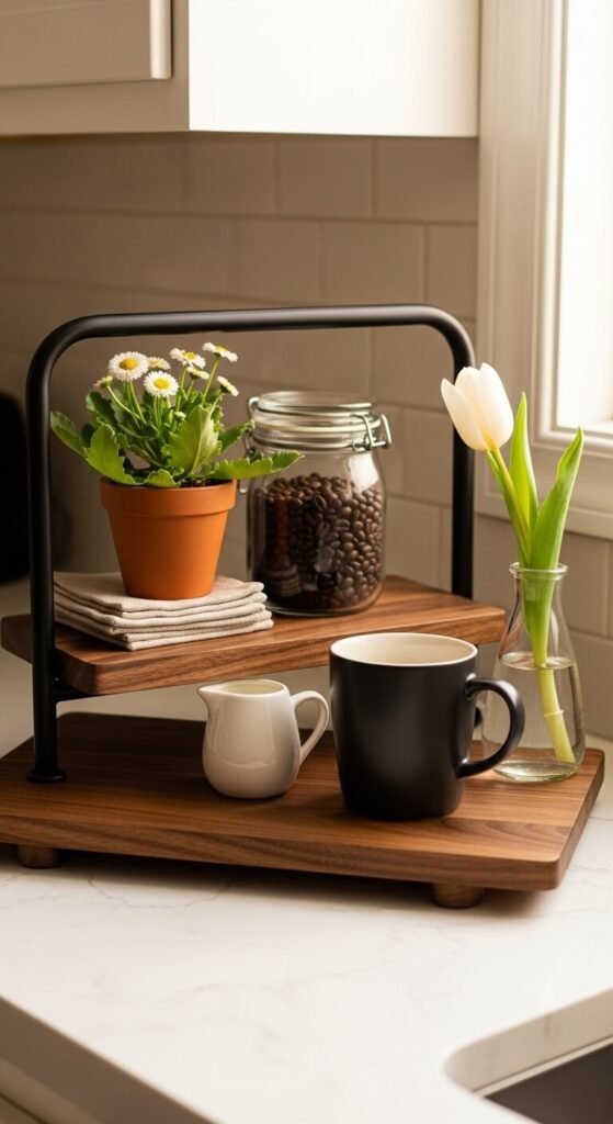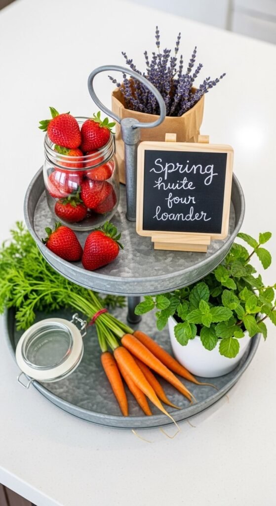 Think of this tray as a tiny farmers market stall in your kitchen. Fill one tier with fresh strawberries in a small jar. Add a bundle of carrots with the tops still on. Place a small potted mint plant and a paper bag of lavender. Use a mini chalkboard sign to write something seasonal. This setup is functional because the food is actually usable. Replace items as they run out. It brings a market-fresh energy to an everyday kitchen surface and requires zero decorating experience.