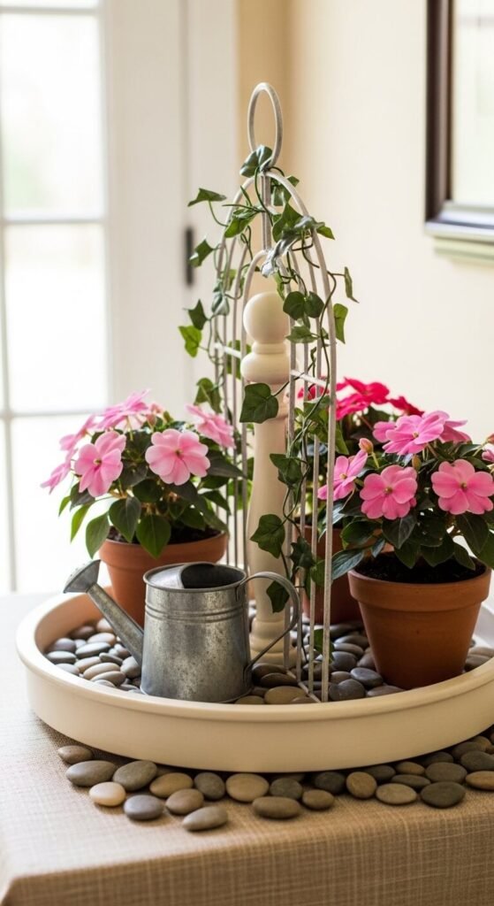 A small decorative arch or gate-shaped metal piece is a show-stopping centerpiece for a spring tray. Wrap it with faux climbing vines or small silk flowers. Flank it with small clay pots of pink or white blooms. Add a tiny watering can and flat river pebbles for a garden path feel. This setup works especially well in an entryway or foyer. The arch draws the eye immediately and makes the tray feel like a tiny garden scene. Metal arch pieces are easy to find in craft stores.