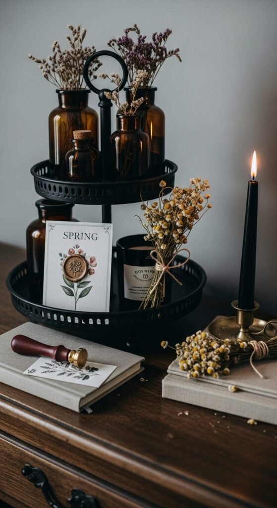 For a moody, vintage-inspired spring tray, use amber or dark glass apothecary bottles filled with dried florals like chamomile, lavender, or baby’s breath. Add a brass taper candle holder and a linen-bound journal. Lay a botanical postcard or wax seal alongside them. This is spring with a darker, more romantic edge. It works beautifully in a library, study, or moody living room. Apothecary bottles are widely available at thrift stores and antique markets for a few dollars each.