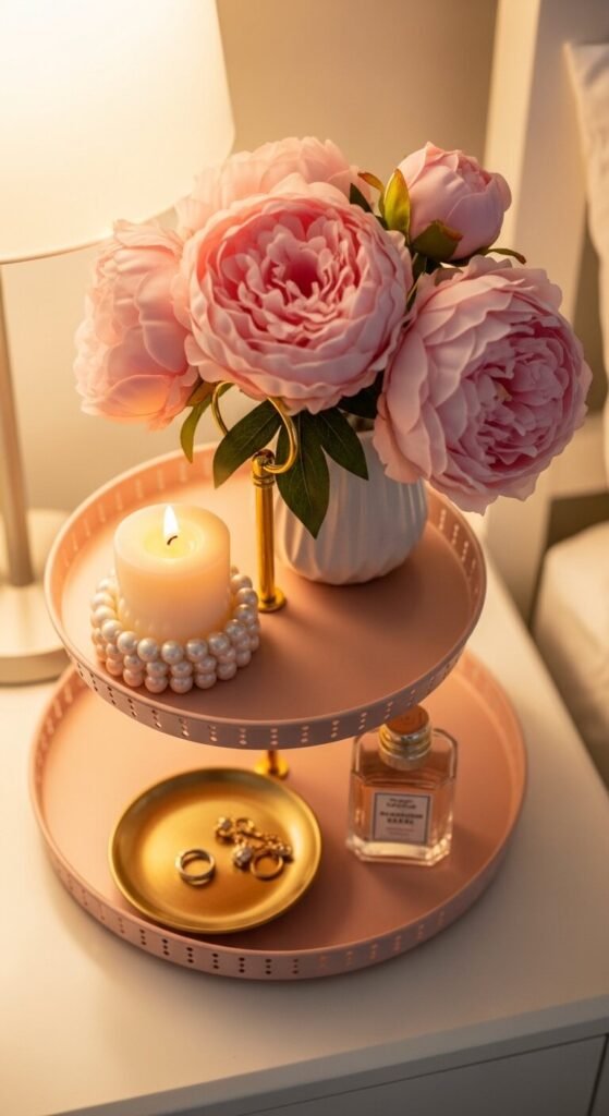 Peonies are the ultimate spring flower. Use large faux peony stems in blush or white and arrange them in a small vase as your star piece. Wrap a pearl bead ring around a pillar candle for a soft, romantic detail. Add a gold jewelry dish, a small perfume bottle, and perhaps a tiny framed photo. This setup is made for a bedroom nightstand or vanity tray. It feels special without requiring real flowers that wilt. Faux peonies from craft stores look remarkably real.