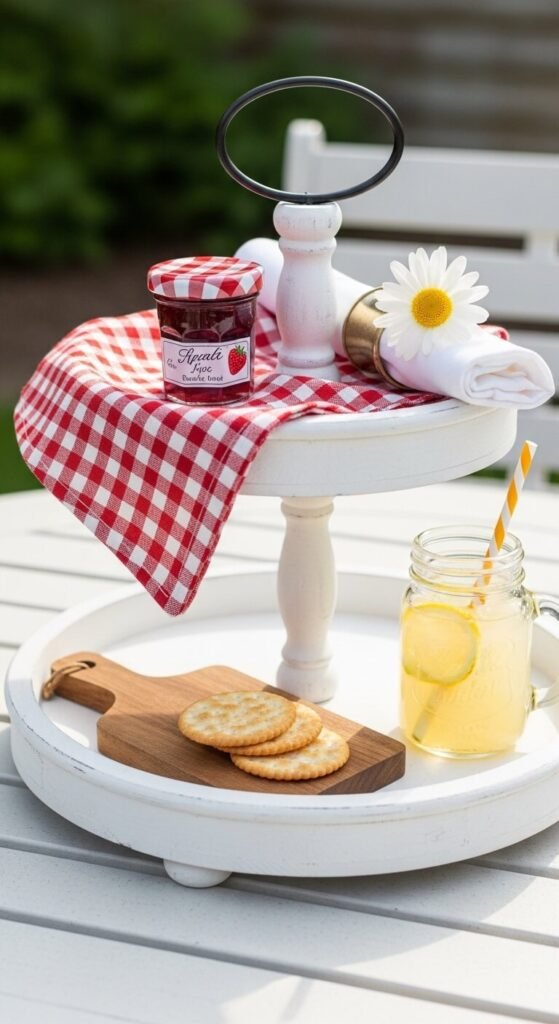 This setup captures that warm, picnic-afternoon energy. Drape a small gingham or checkered fabric piece across one tier. Add a mini mason jar of lemonade, a tiny jar of jam, and a small wooden board with crackers. Tuck a fresh daisy into a napkin ring. This tray tells a story — sunshine, good food, and slow afternoons. It works on a back patio or kitchen island beautifully. You likely already have most of these items in your kitchen. No shopping required.