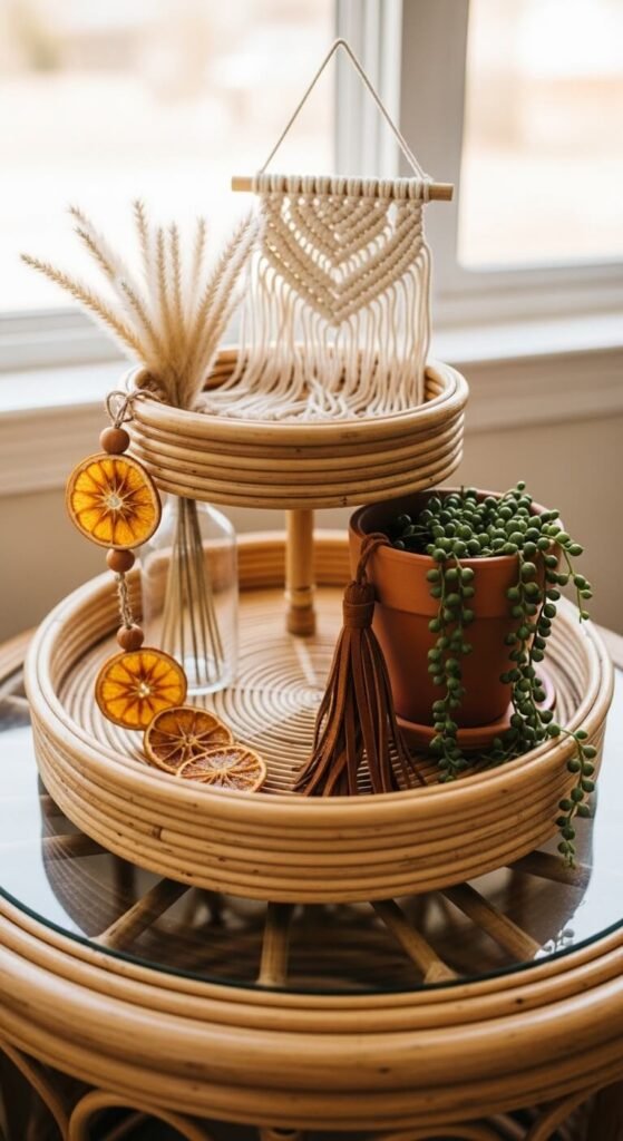 Boho spring decor is all about texture and natural materials. Use a rattan or wicker tray if you have one — or style a regular tray with rattan accents. Add pampas grass in a small clay pot, a mini macramé hanging, and a trailing succulent like string of pearls. Layer in a leather tassel and dried orange slices for warm color. The whole palette should stay in earthy beige, terracotta, and sage tones. This setup requires zero matching — the more organic, the better.