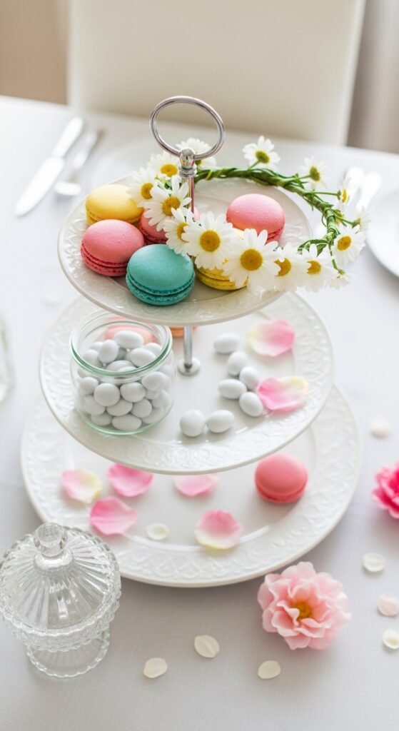 A cake stand works perfectly as a spring tiered tray. Style it like a garden party dessert display. Stack pastel macarons or sugar cookies on one tier. Add a small crystal dish of candy-coated almonds and a glass jar of pink lemonade candies. Drape a small daisy flower crown across one of the tiers for a whimsical detail. Scatter sugar flower petals for color. This setup is perfect for Easter brunch, a baby shower, or a simple spring gathering. Guests will love it.