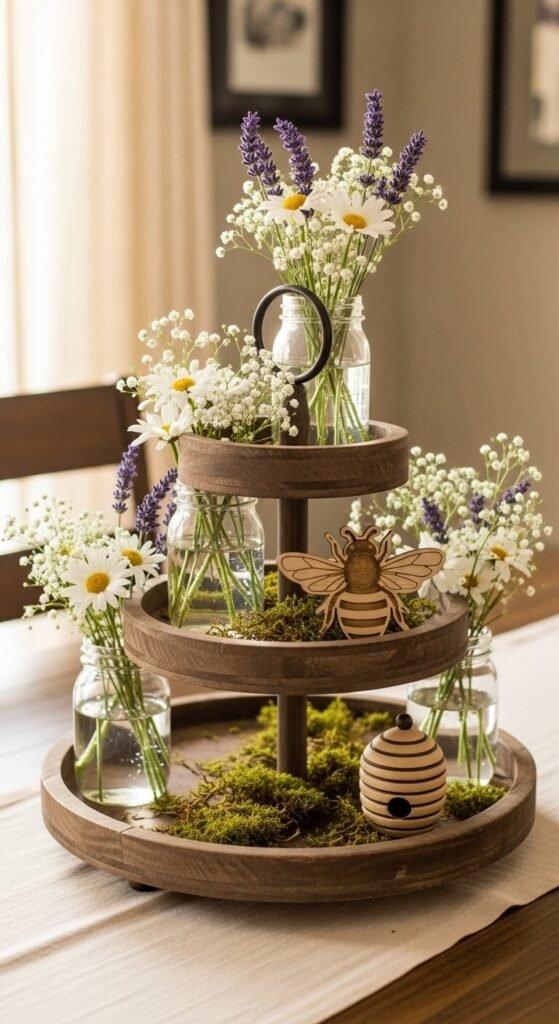 Wildflowers instantly make a tray feel collected and casual. Use small mason jars or bud vases to hold stems of daisies, lavender, and baby’s breath. Mix faux and real if you want longevity. Add a wooden bee cutout or a honeybee figurine for a garden-themed detail. Scatter a little faux moss between jars. The imperfect, just-picked look is the goal here. Nothing should feel too perfect. Grab wildflower stems from the craft store and arrange them loosely.