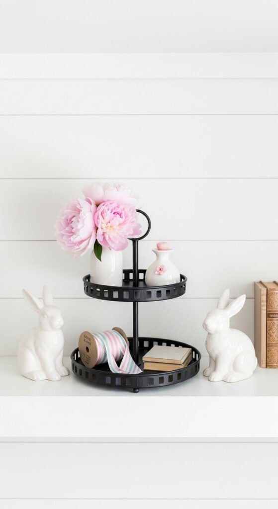 Two matching bunny figurines work like bookends on either side of the tray. Let them frame a central piece — a bud vase, a candle, or a small lantern. Fill the middle space with a few spring-colored ribbon spools or a stacked set of small faux books. Keep the color palette tight — white, blush, and sage look excellent together. This setup has a clean symmetry that makes the tray look intentional without overthinking it. Grab bunny figurines at any craft store.