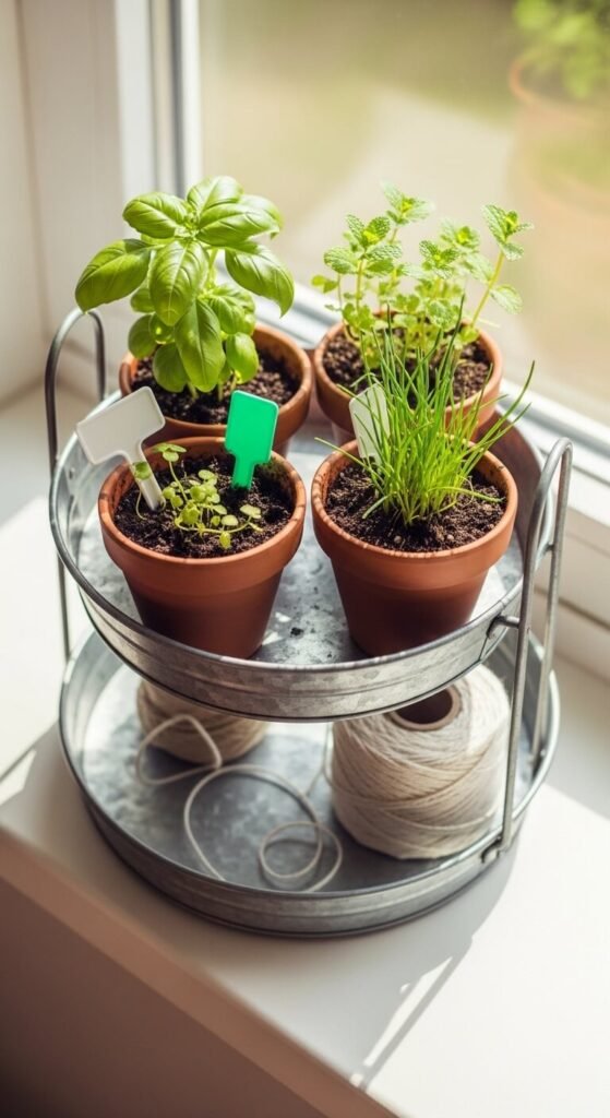 This one is both decorative and actually useful. Plant small terracotta pots with basil, mint, or chives and arrange them on your tray. Add small garden marker stakes with hand-lettered labels for a charming, cottage-garden feel. A roll of twine or a small watering can adds a finishing touch. This setup works perfectly for kitchen tiered trays. You get spring decor and fresh herbs for cooking at the same time. Pots and seeds cost almost nothing at garden centers.