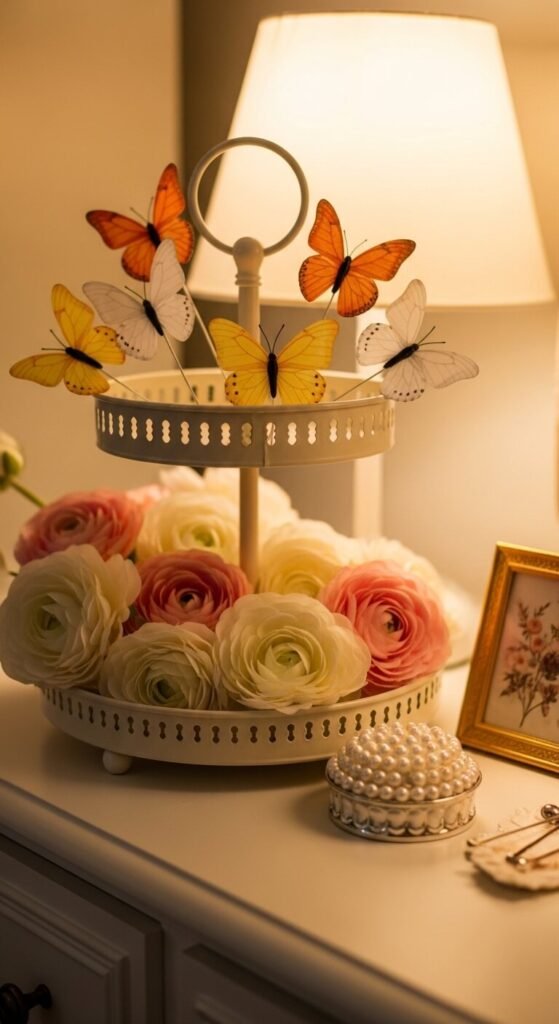 Spring and butterflies go hand in hand. Use butterfly picks or figurines — the kind that come on wire stems — and tuck them into a small floral arrangement on the top tier. Use silk ranunculus or tulips in soft blush and cream. Add a small framed botanical print or a pearl dish on the lower tier. This setup has a romantic, feminine quality that works beautifully in a bedroom or bathroom. The butterfly picks are inexpensive and widely available at craft stores.