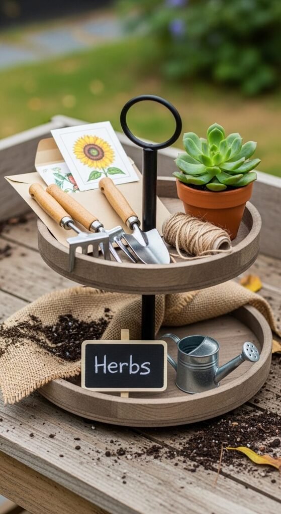 Mini garden tools make an unexpected and charming tray accent. Look for small decorative garden tool sets at hobby stores or online. Add a seed packet, a small succulent, and a bit of burlap ribbon tied around a tier for texture. A chalkboard garden marker with a spring word like “Grow” or “Bloom” adds a personal touch. This setup works great for a mudroom, sunroom, or back entry tray. It tells a simple story — spring is here and the garden is calling.