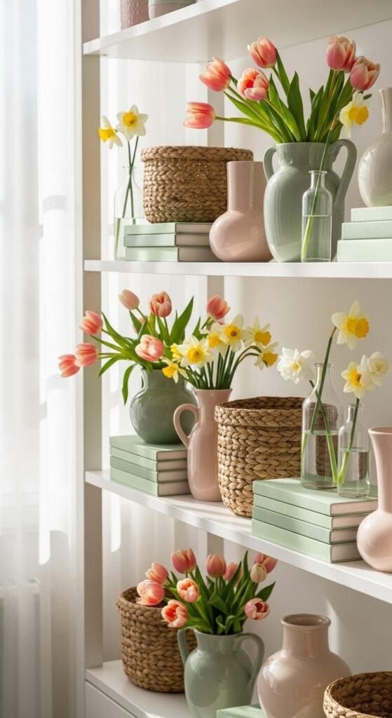 Try a tall vase, medium bowl, and short candle together. Leave empty space between groups to avoid clutter. This styling rule works for any season but feels especially good with light spring colors. The negative space makes your shelves breathe.