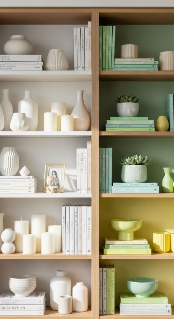 Dedicate each shelf or section to a color family. All whites and creams on one level, pastels on another, or earthy tones together. This organization system looks planned and calm.