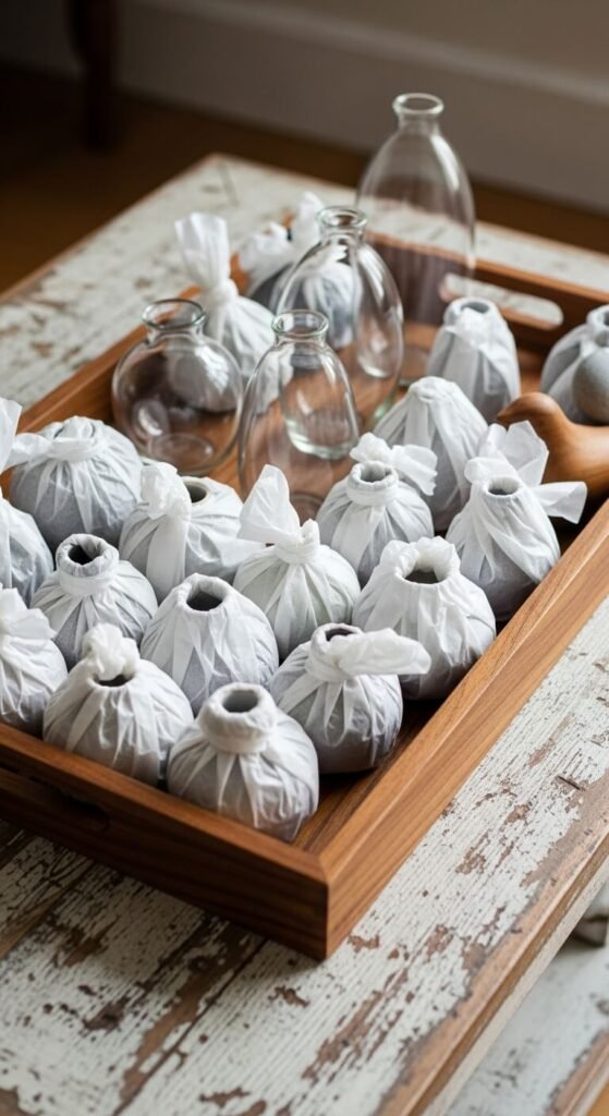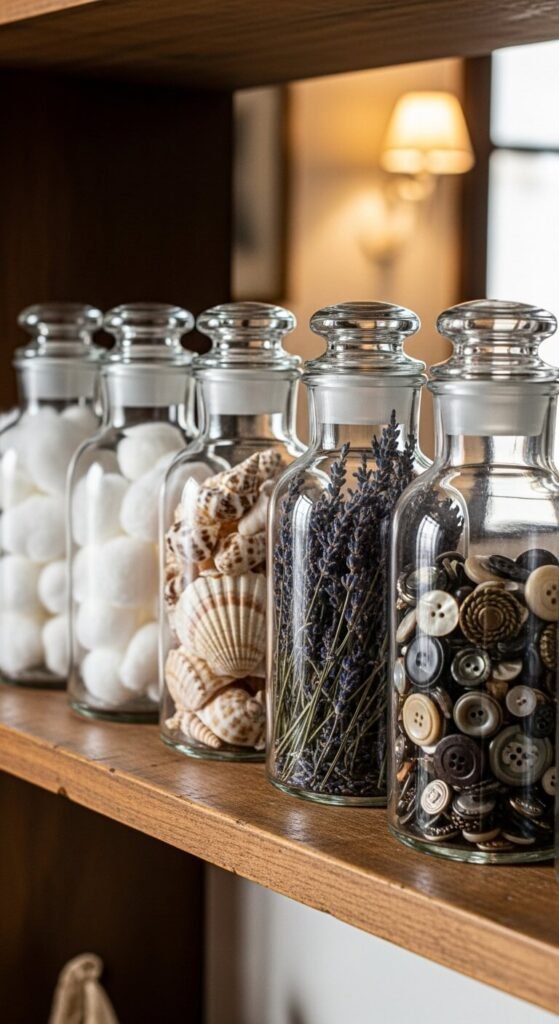 Buy sets of jars at dollar stores for $1 each. Label them with small tags if needed. The repetition looks intentional rather than messy. Group containers by size or arrange them in a row. You can see everything while keeping it contained and dust-free.