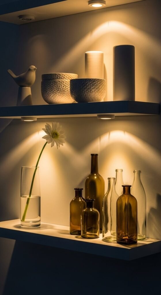 Small LED lights make shelves pop, especially in darker rooms. Stick-on battery pucks or plug-in strip lights are easy for renters. Position them under shelves to light items below.