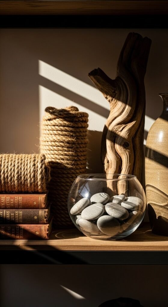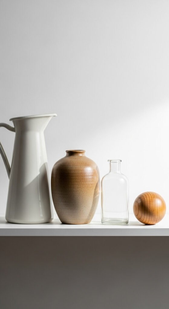 Combine wood, stone, metal, and ceramic for tactile interest. Each material has different grain, weight, and finish. The variety makes displays feel collected over time rather than bought all at once.