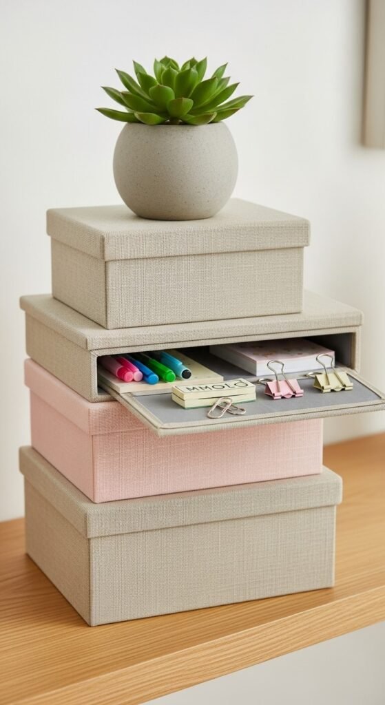 Use wrapping paper remnants and spray adhesive from craft stores. Total cost: $3-5 per box. Label the ends so you know what’s inside. These work great for paperwork, cables, or seasonal decorations. They look like decor while doing real work.