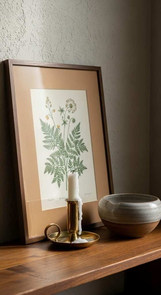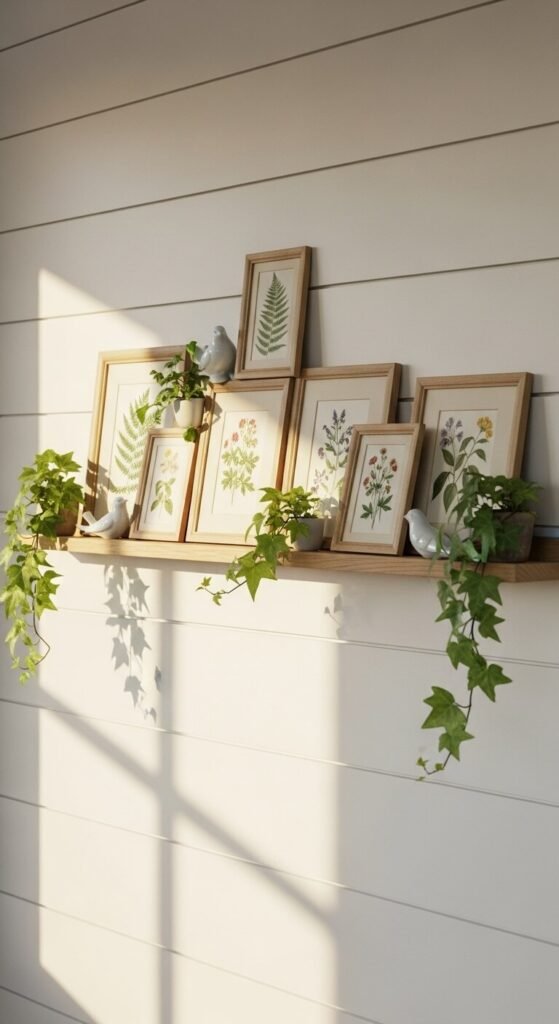 Instead of hanging frames, lean them on shelves. This casual approach feels relaxed and lets you change things easily. Layer smaller objects in front for depth.