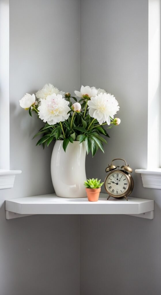 Pre-made corner shelves cost $12-20 at home stores. They install with two brackets. The angled space naturally draws attention. Use them in bathrooms, offices, or bedrooms where every inch counts. Fill them with items you want to see daily.