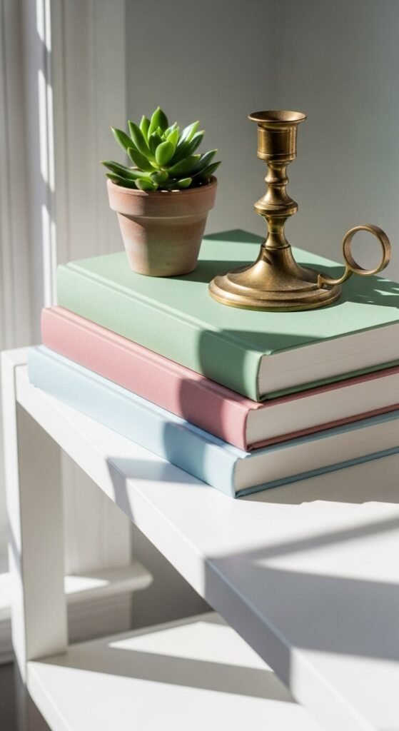Mix hardcovers and paperbacks to create different stack heights. Put your prettiest book covers facing out. This trick works great for renters who can’t install extra shelving. You’ll fit more decorative pieces without buying new furniture.