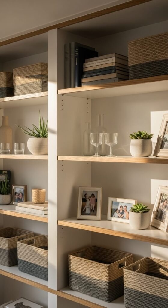 Heavy or oversized items belong on bottom shelves for safety and visual weight. Large baskets, thick coffee table books, or substantial vases anchor the display. This draws the eye downward and balances lighter items above.