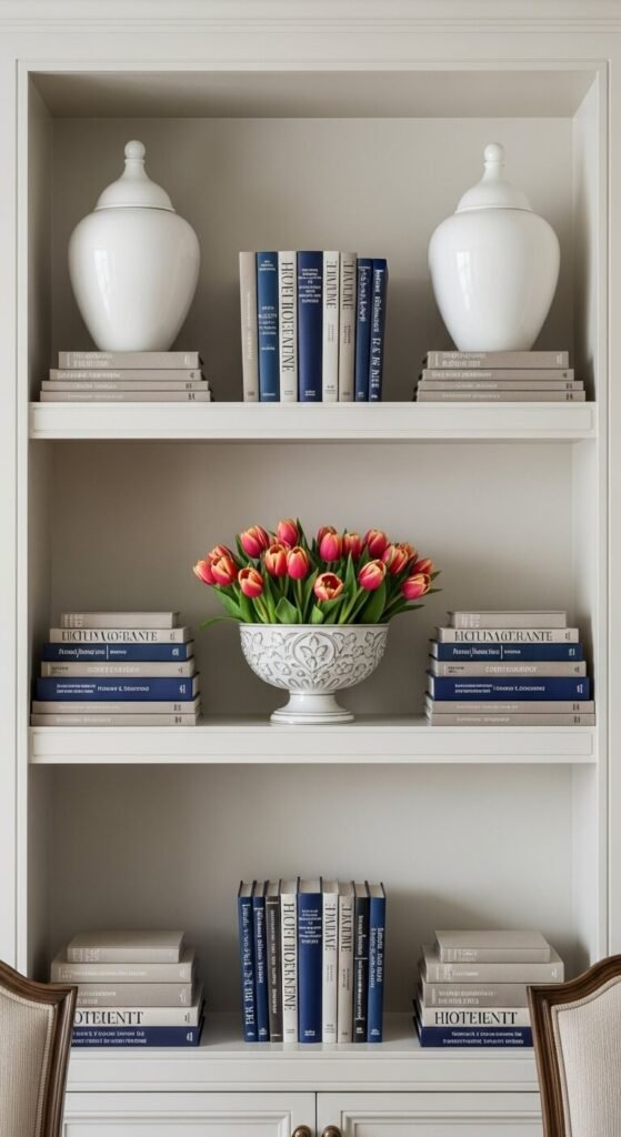 Create mirror-image arrangements for dining rooms or formal areas. Place identical items on both shelf ends with a centerpiece in the middle. This classical approach feels calm and elegant.