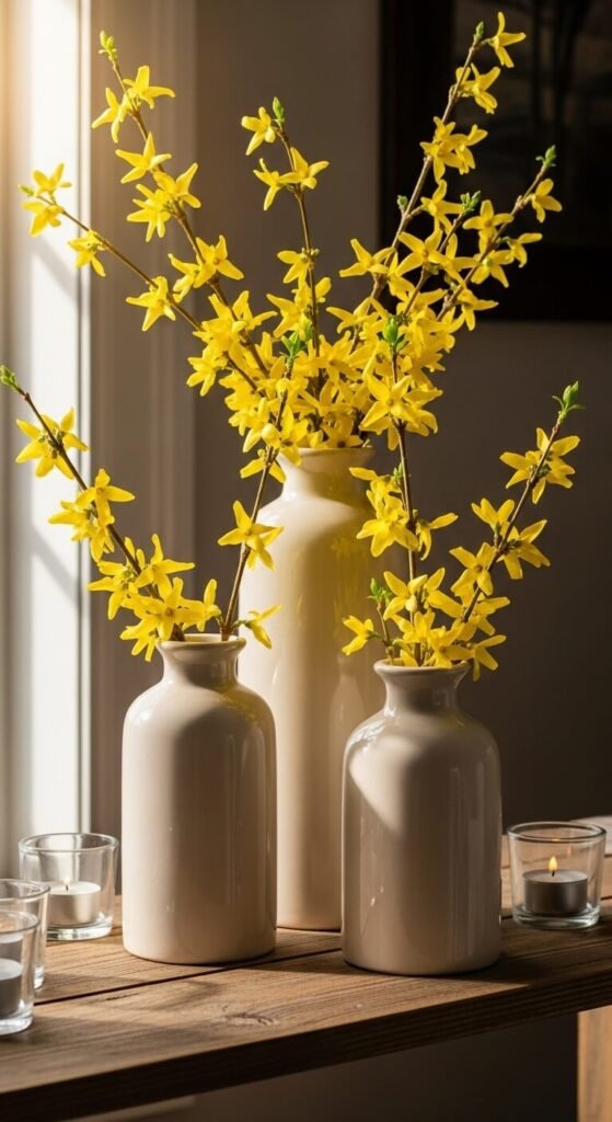 Prune branches from your yard or buy them for $5-10 at grocery stores. Cut them to different heights for interest. The vertical lines draw eyes upward, making ceilings feel higher. Replace water weekly or let them dry naturally for zero-maintenance decor.