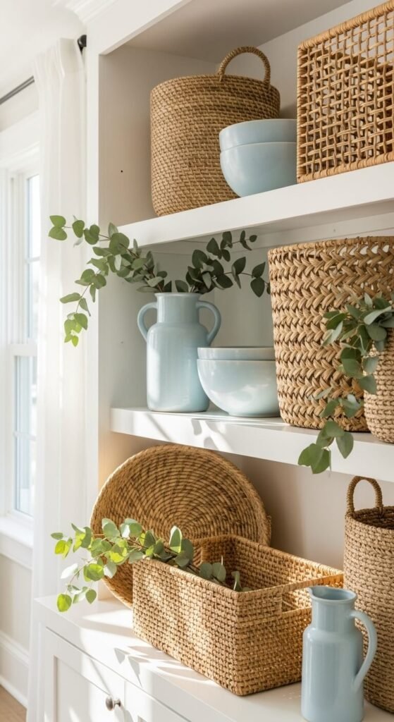 Thrift stores have great vintage baskets for $3-8. Mix different weave patterns and natural tones. Measure your shelf depth before shopping so baskets fit properly. Pull them out like drawers when you need what’s inside. This keeps surfaces looking tidy year-round.