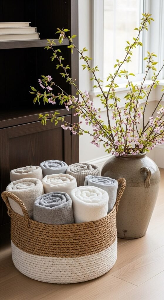 Baskets hide clutter while adding texture. Tuck away mail, remotes, or extra supplies in labeled baskets. The woven material feels seasonal without being overly themed.