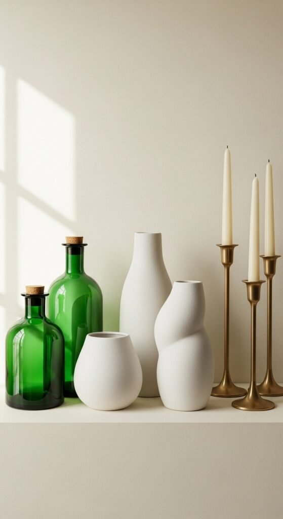 Create a visual flow by placing tallest items on one side and shortest on the other. This gentle slope guides the eye naturally across the shelf. It feels organized without being rigid.