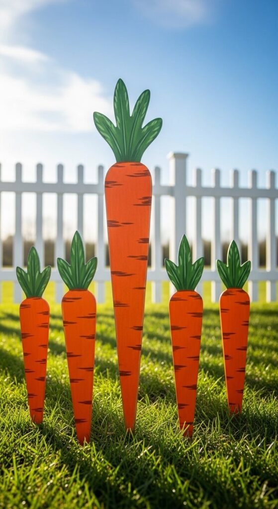 Wooden yard stakes shaped like carrots look adorable in a flower bed or front lawn. Cut simple carrot silhouettes from scrap wood or thin plywood. Sand the edges. Paint them orange with green tops. Seal with outdoor paint or a waterproof topcoat. Push them into the ground with a wooden dowel attached to the back. A pack of three to five stakes adds whimsy to any yard. Budget around $5–$8 total for materials.