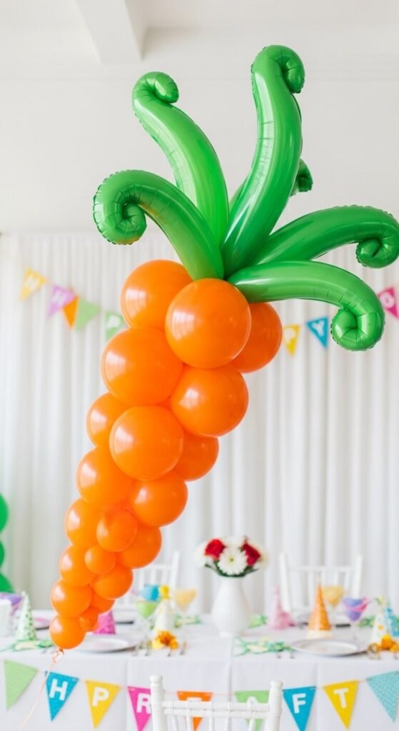 Balloon carrots are a showstopper at any spring party. Use a long orange balloon for the body. Cluster several green balloons at the top for the leaves. Tape or tie them together to make a giant carrot shape. Prop it in a corner or attach to a wall for a photo backdrop. Balloons cost very little and take minutes to arrange. Kids go absolutely wild for this. Scale it up for a big impact without spending much at all.