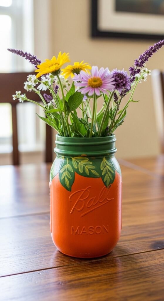 Painted mason jars can become charming carrot vases in under 30 minutes. Paint the jar orange. Add painted or drawn green leaf shapes near the opening at the top. Fill with flowers, greenery, or even faux stems. Use them as individual table centerpieces or group three together on a tray. You can use chalkboard paint for texture, or regular acrylic sealed with Mod Podge. They look adorable and cost almost nothing if you already have jars at home.