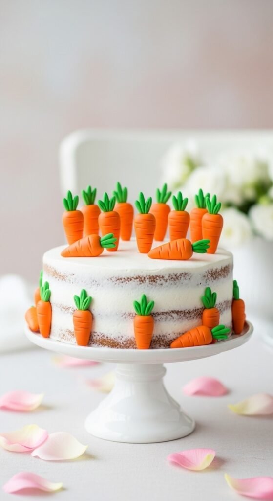 Tiny carrot cake toppers add a whimsical finishing touch to any baked creation. Make them from air-dry clay or fondant. Shape into small cone carrots. Paint or color them orange with green leaf tops. Press them gently into the frosting as a cluster arrangement. You can also use store-bought fondant cutters for a quicker version. These work on birthday cakes, cupcakes, or even cookies. They photograph beautifully and delight every guest at the table.