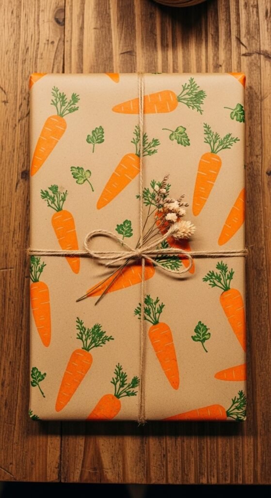 Use an actual carrot to stamp your own gift wrap. Cut a carrot in half lengthwise. Press the flat side into orange paint. Stamp onto plain kraft paper. Add green leaf prints using a fork dipped in green paint. Let dry and wrap your gifts. It’s a genuinely original and handmade look that people always love. No special tools needed. Reuse the carrot a dozen times before it wears out. This is a fun activity to do with kids too.